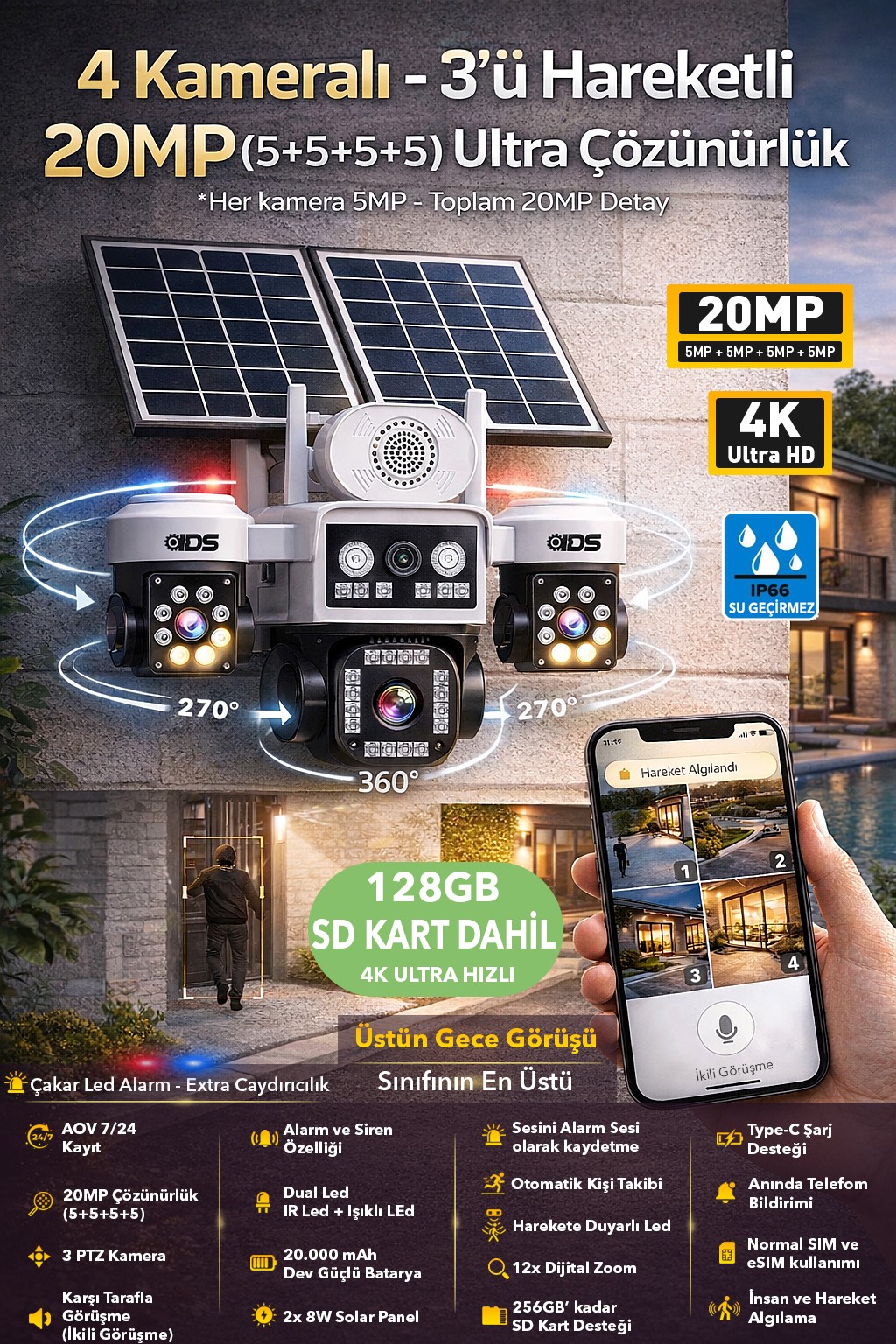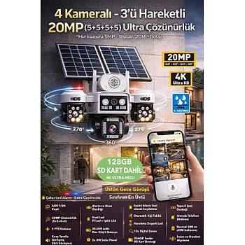 Güvenlikte sınırları kaldıran bu 4 kameralı 20MP (5+5+5+5) solar güvenlik kamerası, tek bir cihazla geniş alanları kontrol altına almanızı sağlar. Üstelik 3 kamerası telefondan hareket ettirilebilir (PTZ) yapısı sayesinde istediğiniz noktayı anlık olarak kontrol edebilirsiniz.