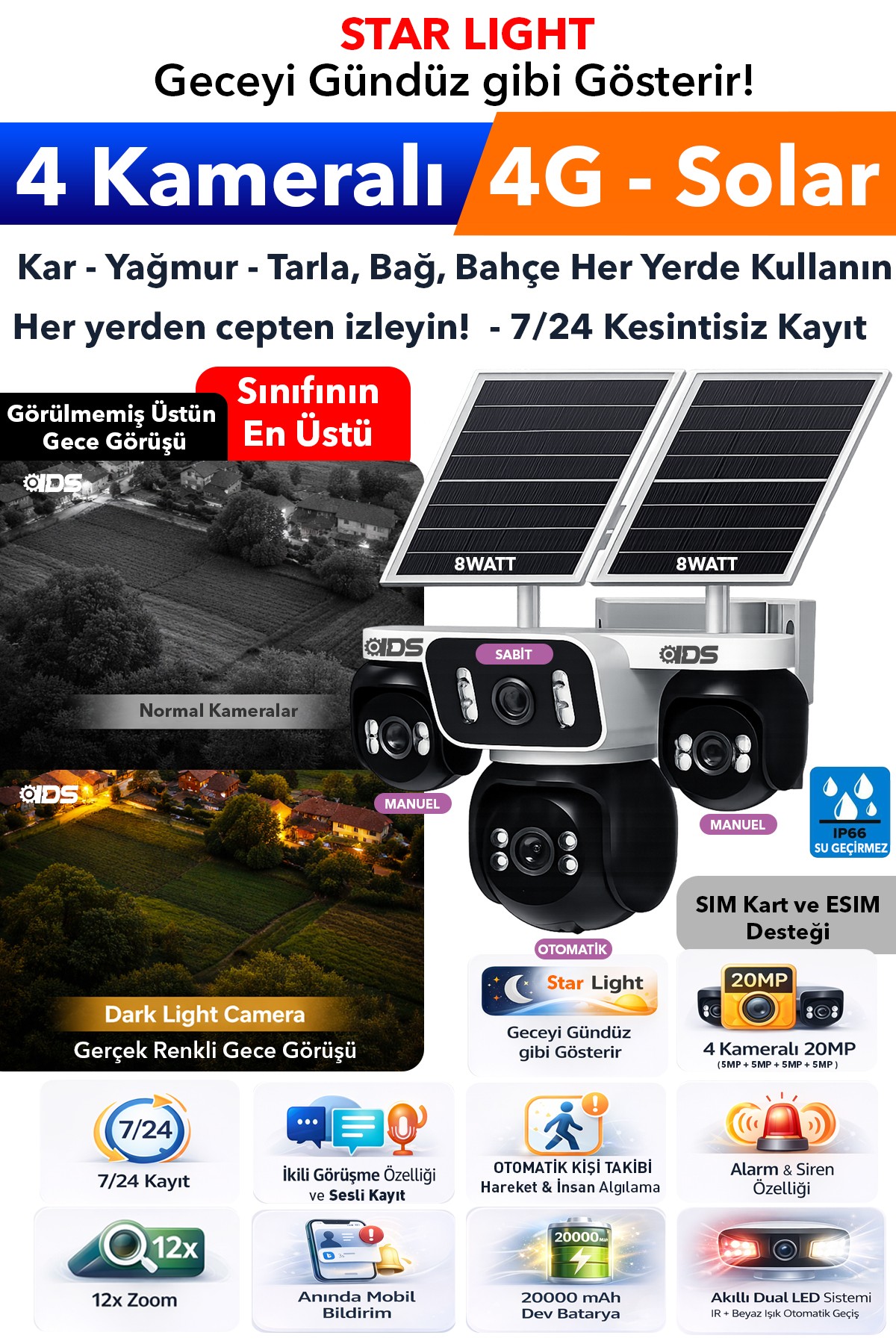 Solar kamera, sim kartlı kamera, 4G güvenlik kamerası, tarla kamerası, bağ bahçe kamerası, solar güvenlik kamerası, starlight gece görüş kamerası, 20MP güvenlik kamerası, 4 kameralı güvenlik sistemi, solar ip kamera.