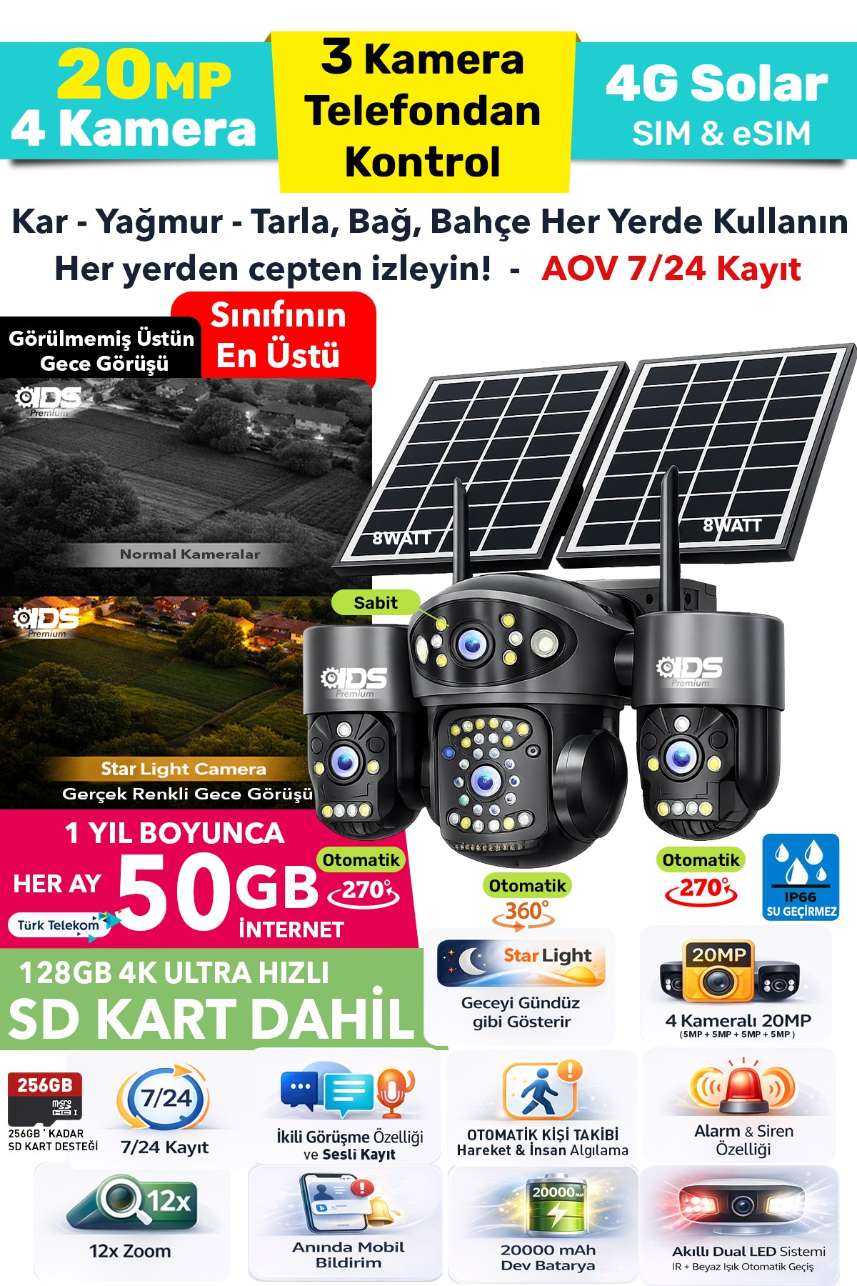 İnternet altyapısına ihtiyaç duymadan çalışan 4G destekli bu kamera, özellikle tarla, bağ, bahçe, şantiye ve elektrik olmayan alanlar için mükemmel bir çözümdür.