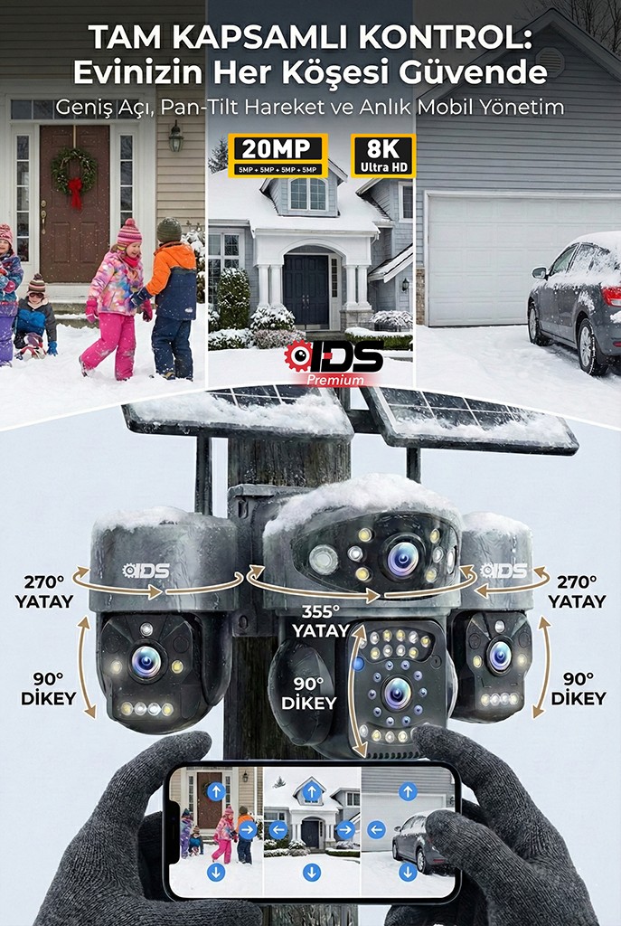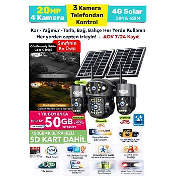 Güvenlikte sınırları kaldıran bu 4 kameralı 20MP (5+5+5+5) solar güvenlik kamerası, tek bir cihazla geniş alanları kontrol altına almanızı sağlar. Üstelik 3 kamerası telefondan hareket ettirilebilir (PTZ) yapısı sayesinde istediğiniz noktayı anlık olarak kontrol edebilirsiniz.