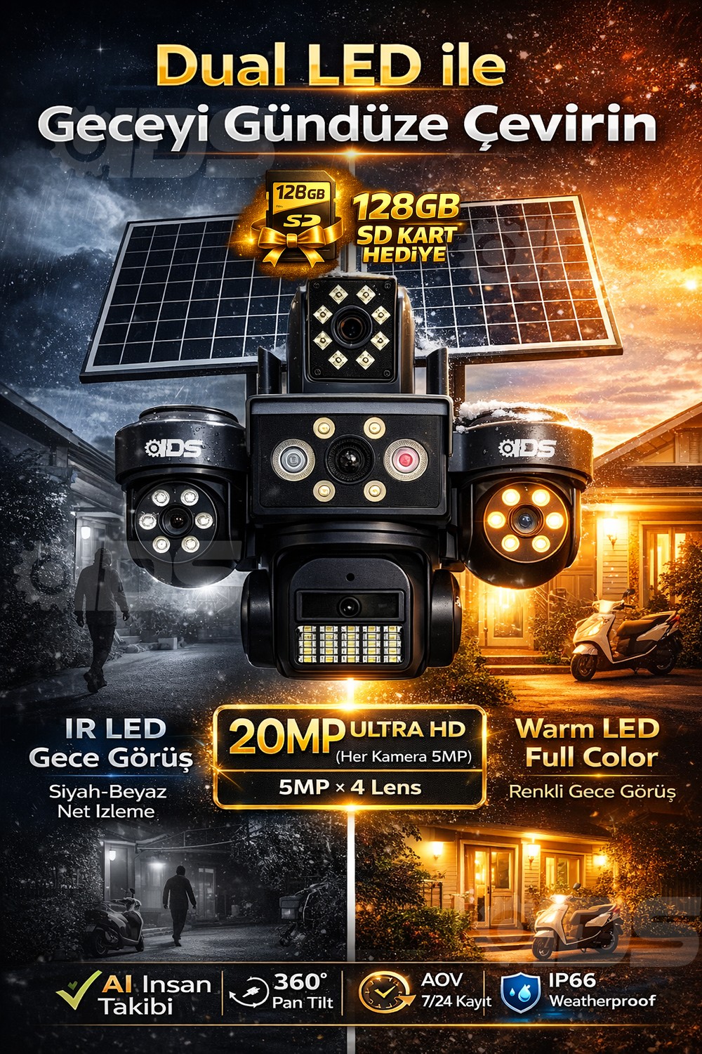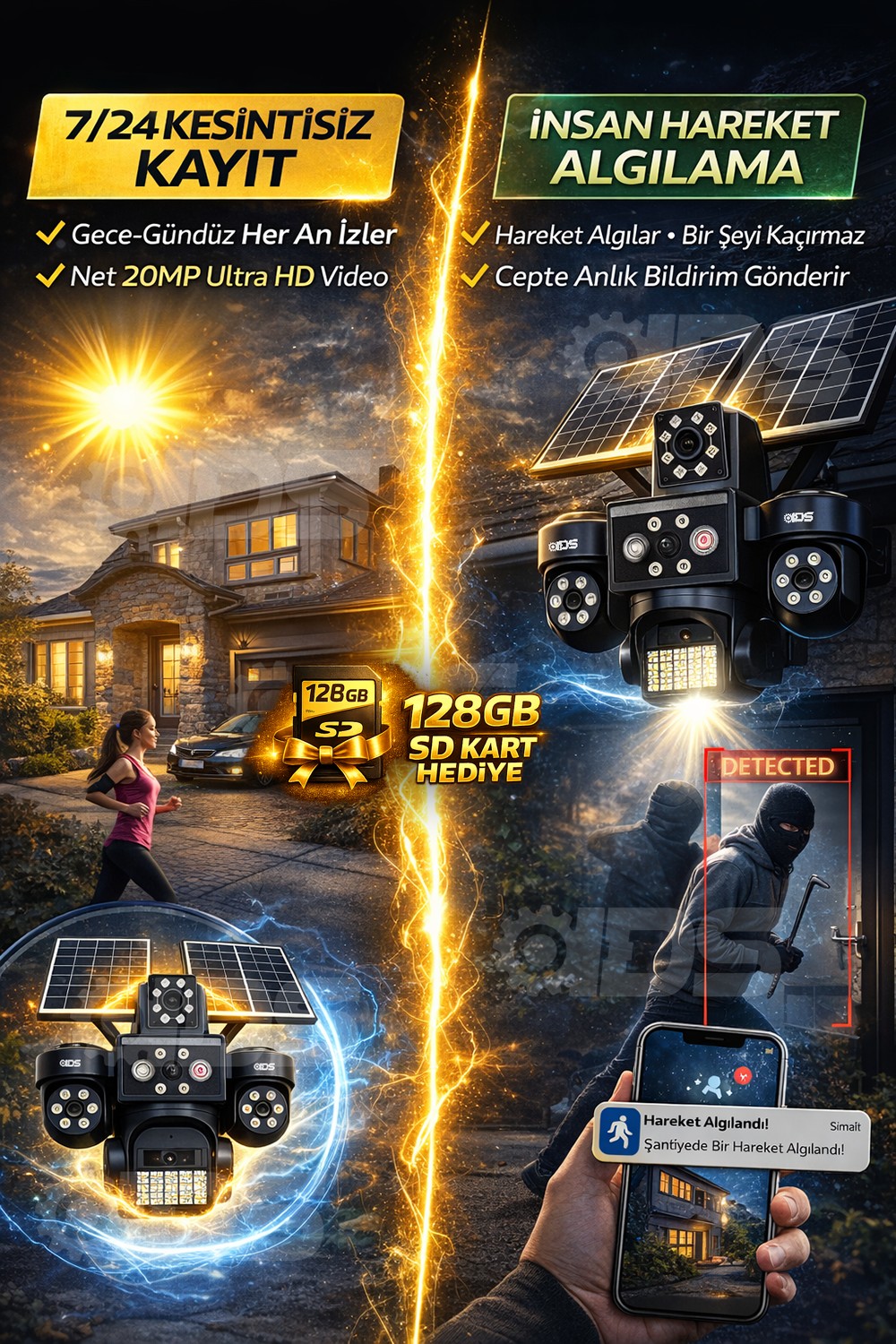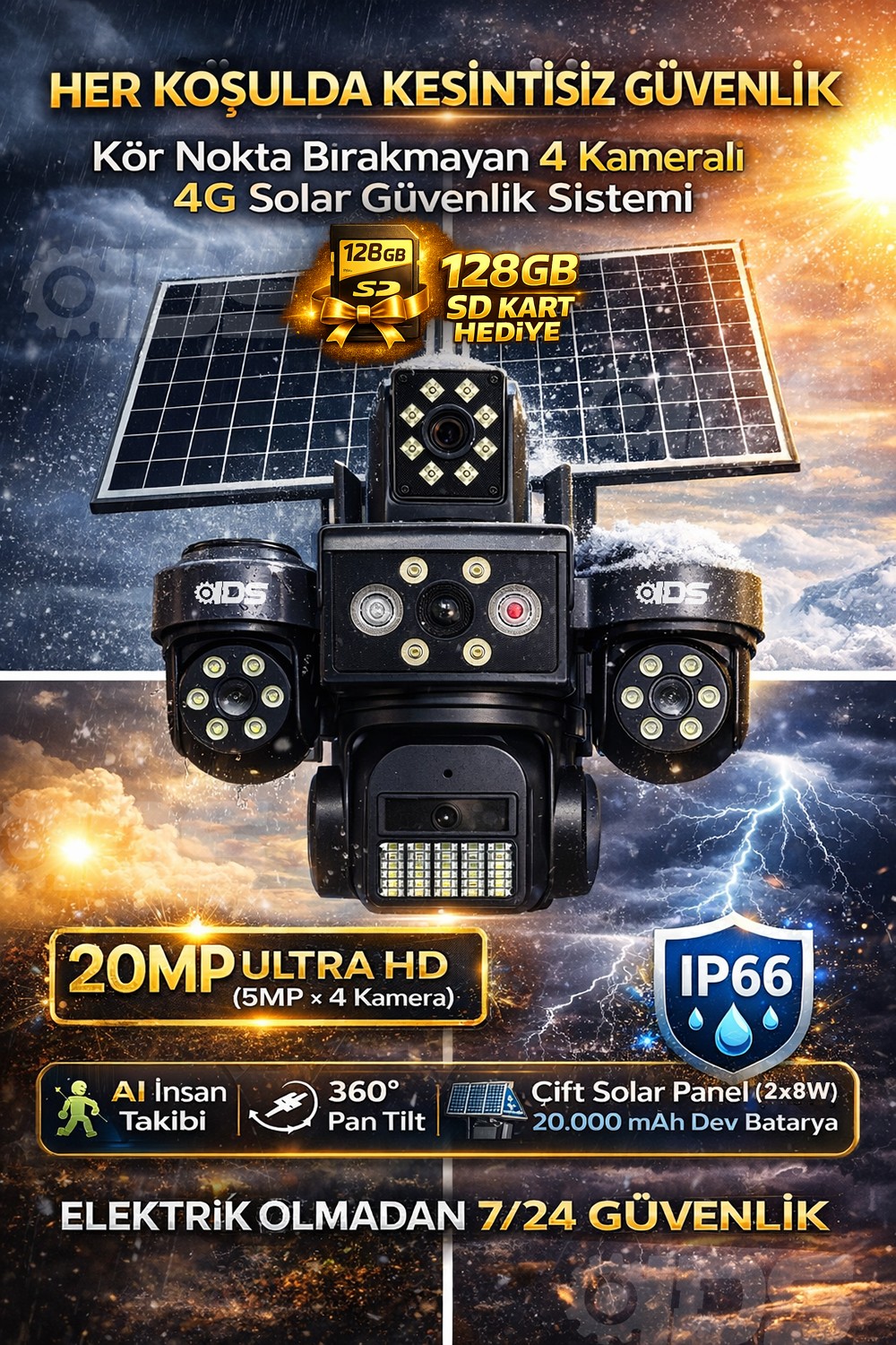 20MP Ultra HD çözünürlük, gelişmiş AI yapay zeka, güçlü batarya ve çift solar panel desteği ile villa, şantiye, tarla ve açık alan güvenliği için profesyonel bir çözümdür.
